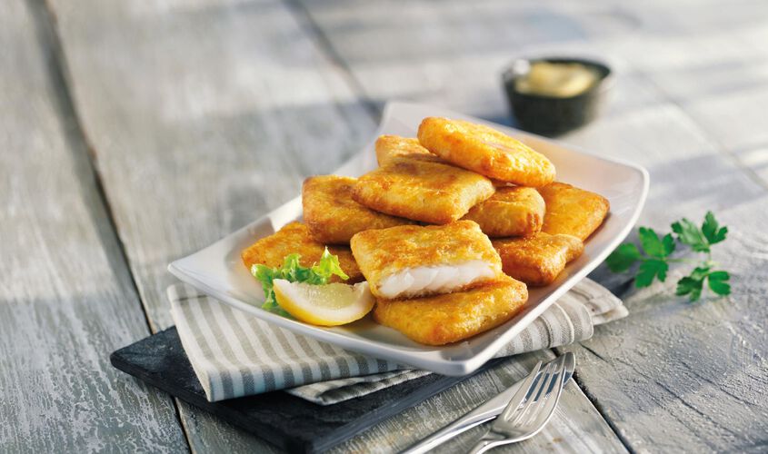 filets de lluç del Pacífic 50%, farina de blat, aigua, oli de gira-sol, midó de blat de moro, sal, gasificants (difosfats, carbonats de sodi), farina de blat de moro, gluten de blat, emulgent (mono-i diglicèrids d'àcids grassos), espessidor (goma guar, goma xantana), dextrosa, espècies (cúrcuma, pebre vermell), colorant (riboflavina).