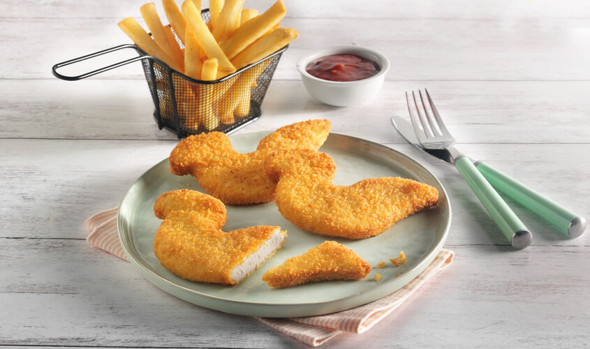 Divertidas y jugosas figuras a base de pechuga de pollo empanada. Ideal para el menú infantil o fiestas de cumpleaños.
